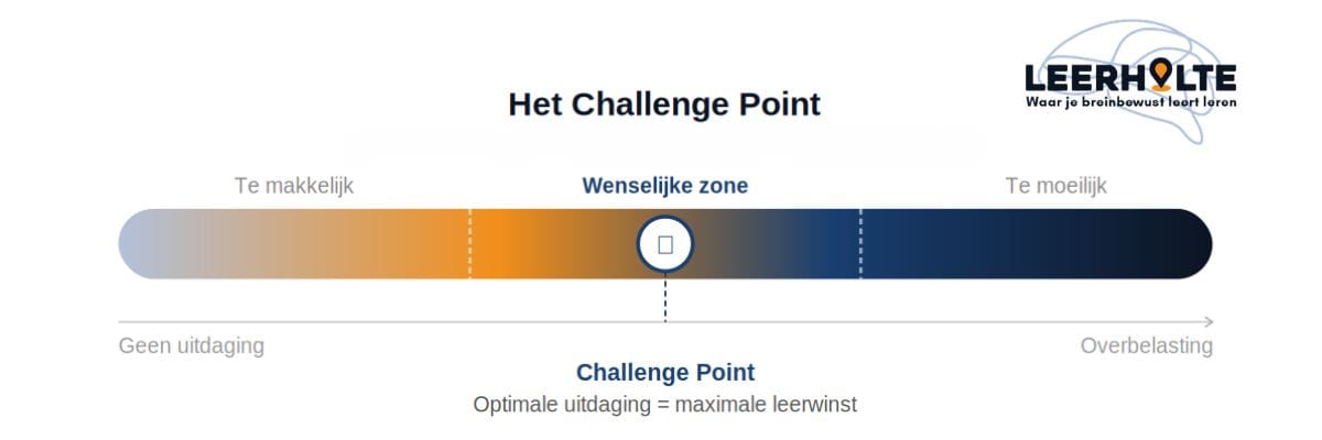 In deel 1 van deze post vertelde ik dat leren moeite moet kosten. Toch betekent dit niet dat elke moeilijkheid wenselijk is. Er is een omslagpunt, ook wel het "Challenge Point" genoemd. Ik zie het als een spectrum dat loopt van té makkelijk (helemaal links = geen leerwinst) naar té moeilijk (helemaal rechts = frustratie en overbelasting). Ergens daartussenin zit het challenge point. Waar dat punt precies ligt, verschilt per leerling en per moment in het leerproces, maar je hebt als docent dus wel een marge om binnen te werken.